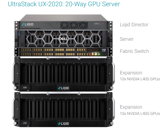UltraStack is available as stand-alone and cluster-ready servers options. While the stand-alone options contains up to 20 GPUs, the cluster-ready servers include up to 16 L40S GPUs, in addition to Liqid IO Accelerator NVMe SSDs, NVIDIA ConnectX-7 NICs and NVIDIA BlueField-3 DPUs, for internode connectivity and efficiency in complex AI environments.