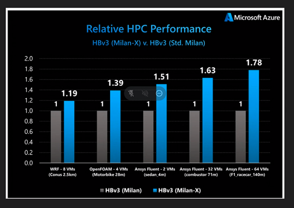 Last March, Microsoft announced the upgrade of Azure HBv3 virtual machines with EPYC 3rd Gen chips. He said Microsoft’s internal tests show the new HBv3-series delivers up to 80 percent higher performance for CFD, 60 percent for EDA RTL (right-to-left), 50 percent higher performance for explicit finite element analysis and 19 percent for weather simulation. Much of that improvement is attributed to the 3D-V Cache in the new EPYC processors. In practical terms, an almost 80 percent runtime improvement on a 140 million-cell ANSYS Fluent CFD model means you can run two jobs in the time it took to do one.