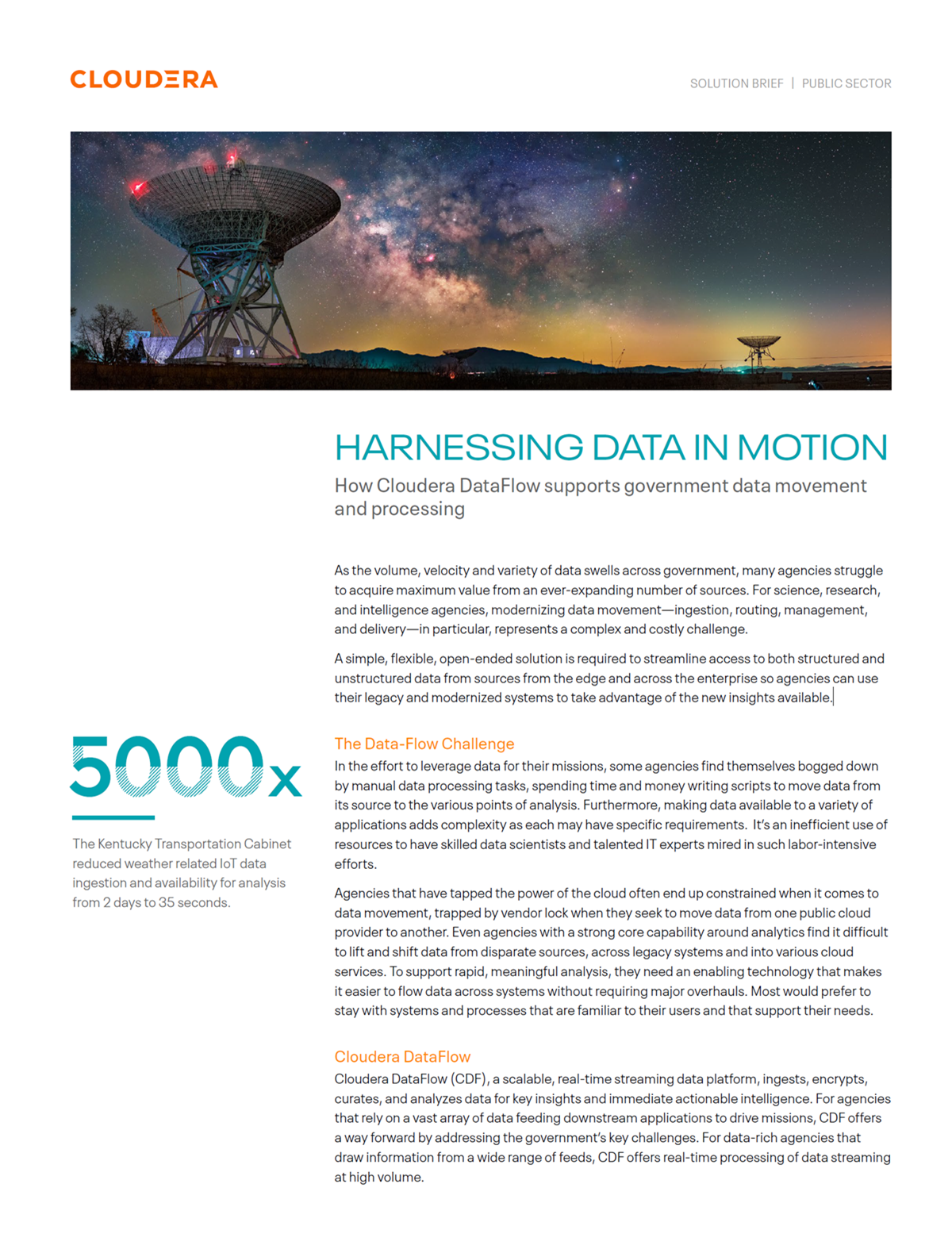 This whitepaper from Cloudera and sponsored by Carahsoft describes how Cloudera DataFlow supports government data movement and processing. A simple, flexible, open-ended solution is required to streamline access to both structured and unstructured data from sources from the edge and across the enterprise so agencies can use their legacy and modernized systems to take advantage of the new insights available.